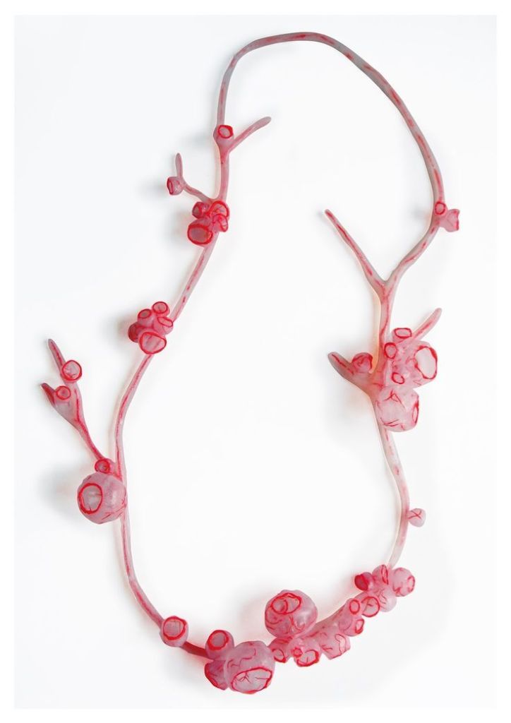 The piece in the image reflects her signature approach, using translucent, cellular forms combined with bold red fibers to evoke a sense of life and energy. The flowing elements mimic nerve pathways, reinforcing the connection between body, biology, and adornment.