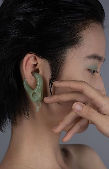 The jade ear cuff, part of her “Of One” collection, reflects this tension. It appears both structured and organic, with delicate curves and hollowed-out sections that suggest release from constraint. Jiao’s choice to work with “non-precious” jades—often dismissed for their lack of saturated color—further questions the way material value is determined. By applying labor-intensive, historically significant techniques to these overlooked stones, she redefines their worth.