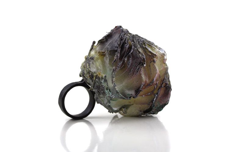 Rita Marcangelo pushes materials to their limits, transforming them beyond recognition. This ring, with its textured, almost molten form, blurs the line between organic decay and deliberate construction. The surface appears weathered and raw, as if it has been unearthed rather than made. Layers of material seem to peel away, revealing a translucent depth beneath dark, charred edges.