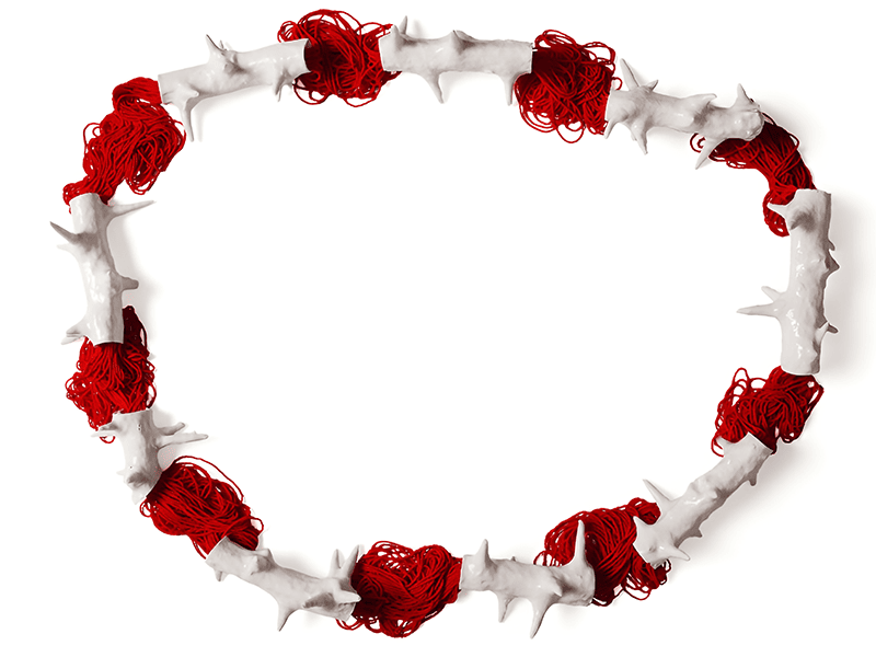 Marlene de Beer’s Thicker than Water (2017) uses natural forms to explore the complexity of human relationships. Crafted from porcelain and red beads, the necklace features sharp thorn-like branches linked by dense clusters of tangled red threads. The porcelain thorns, modeled after South African thorn trees, symbolize both protection and danger, while the vivid red knots evoke blood ties, passion, and the emotional bonds that hold families together. The tension between these elements reflects the layered dynamics of familial and marital relationships.