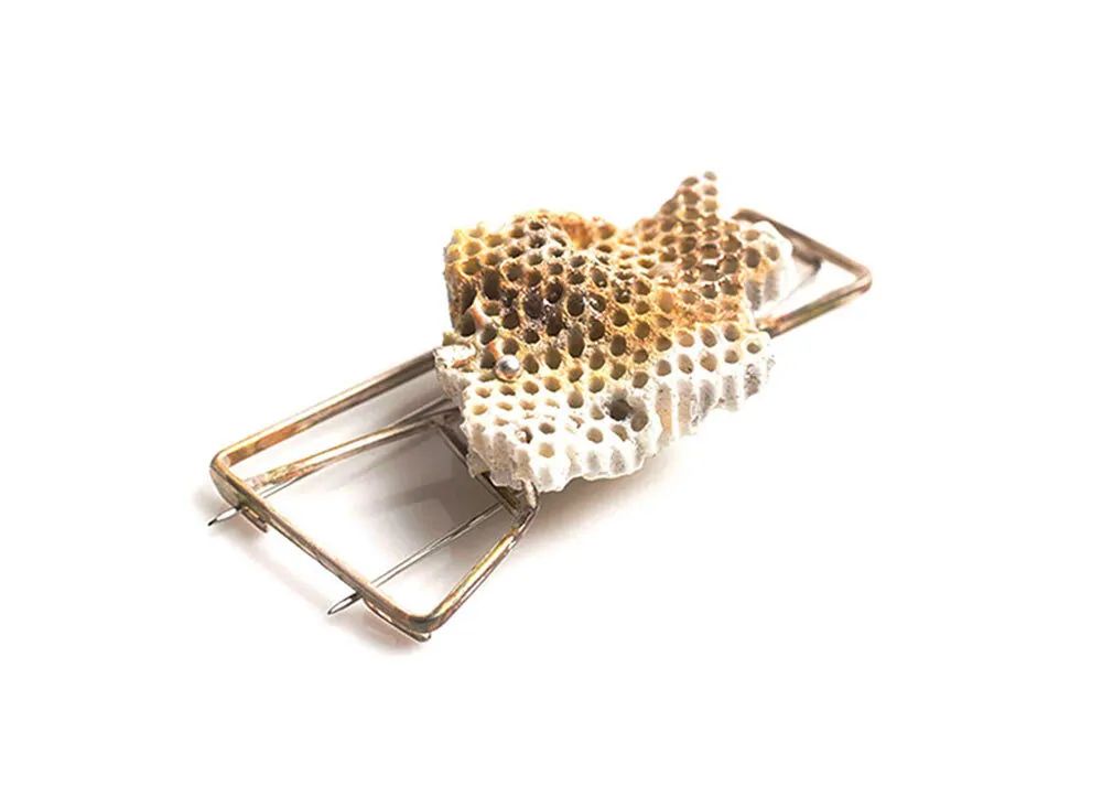 Iro Kaskani’s brooch captures the beauty of natural decay, transforming it into something fragile and enduring. A porous honeycomb-like form resembling coral bone or eroded stone rests within a simple geometric metal frame. The contrast between the organic weathered texture and the rigid structured setting highlights the tension between nature and design. The brooch feels as though it has been found, crafted as though it was unearthed rather than made.