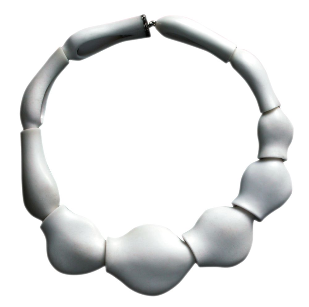 Jewelry is often an accent, but Charlotte De Syllas treats it as sculpture in its own right. The Cacholong Necklace (2005) is a study in form and material, carved with an understanding of both the body and the natural world. Its smooth surfaces and undulating curves recall water-worn stones or the softness of bone, transforming milky cacholong opal into something both sensual and architectural.