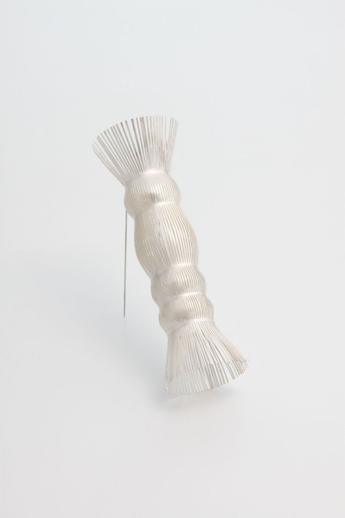 Light dances through the delicate strands of silver, transforming the brooch into a fleeting moment suspended in time. Mineri Matsuura’s 2017 brooch masterfully balances precision and fluidity, with fine silver wires fanning outward as if caught in mid-motion. The interplay of light and shadow enhances its ethereal quality, making the piece feel both weightless and dynamic. The brooch’s form suggests organic movement, reminiscent of wind-swept grass or unraveling silk, while its meticulous craftsmanship underscores Matsuura’s deep understanding of material and structure.