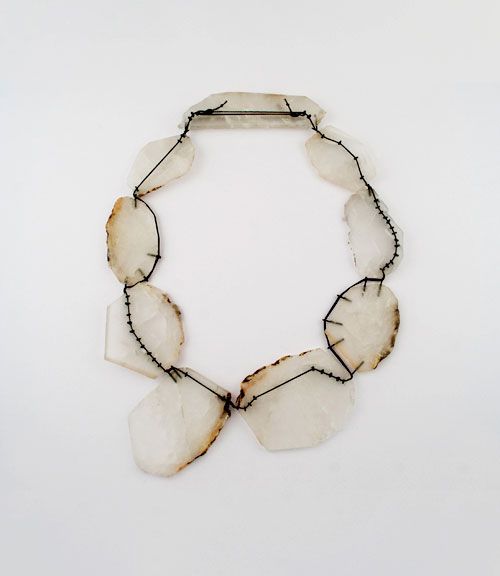 Raw yet refined, Deborah Rudolph’s necklace pieces together shards of what appears to be translucent stone, bound by a delicate web of blackened metal. The fractured edges and subtle earth-toned markings suggest an object shaped by time and the elements, while the meticulous construction reveals the artist’s hand. The contrast between strength and fragility gives the piece a quiet tension. As if it exists in a state of suspension between disintegration and permanence. Rudolph transforms breakage into beauty, elevating imperfection into something precious.