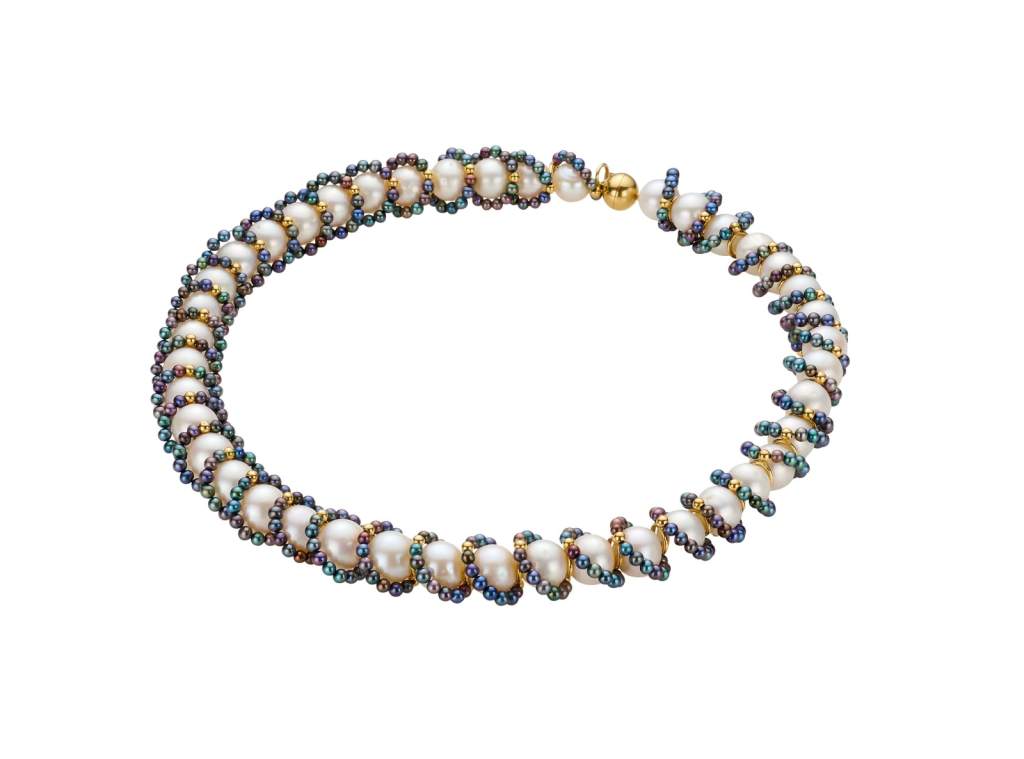Melanie Georgacopoulos reimagines the pearl necklace with a sculptural sensibility that honors tradition while pushing its boundaries. This piece balances classic elegance with an unexpected interplay of form and texture, weaving iridescent peacock pearls around lustrous white freshwater pearls in a rhythmic spiral. The 18 karat gold accents punctuate the composition, enhancing its luminous depth and structural dynamism.