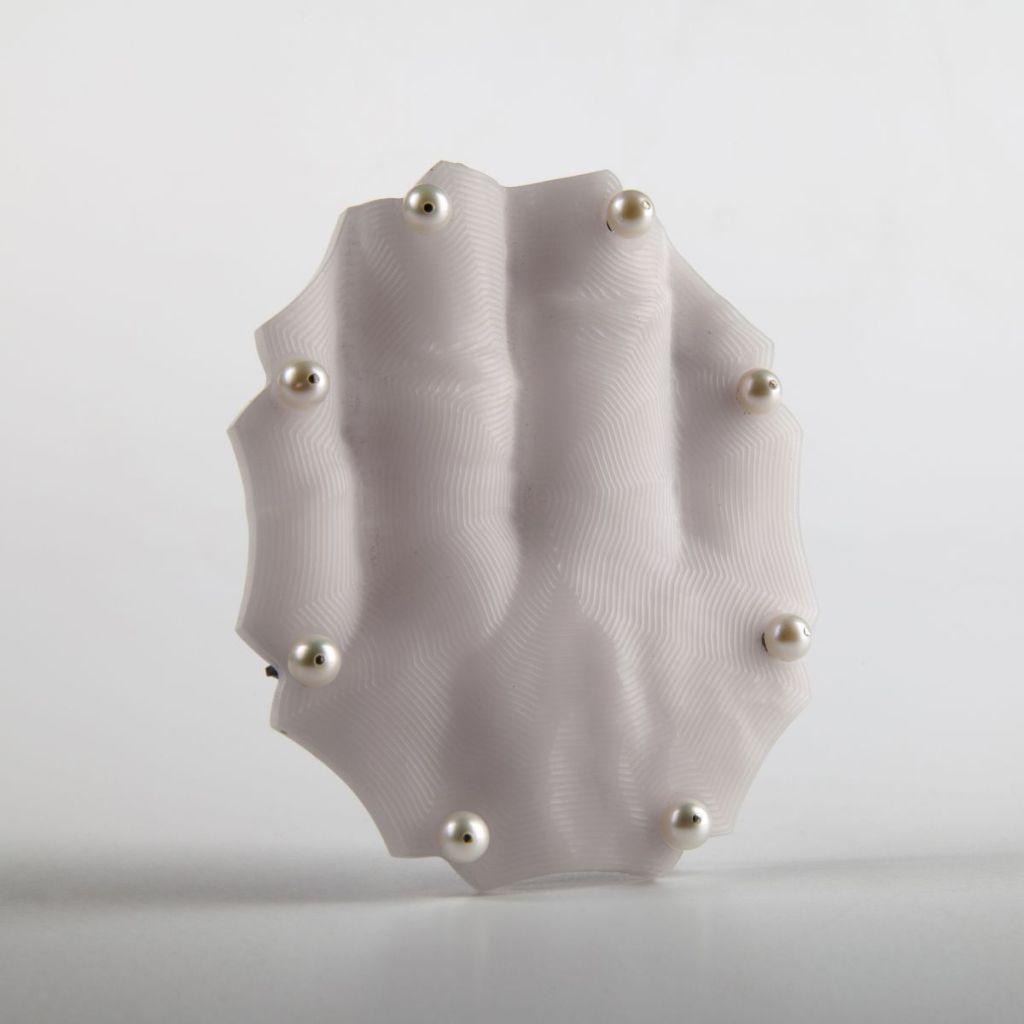Machata’s work challenges conventional notions of preciousness, juxtaposing the refined elegance of pearls with the engineered qualities of corian. The brooch becomes an object of tension, balancing between nature and artifice, softness and structure. It speaks to a broader dialogue in contemporary jewelry, where materiality is reconsidered and ornamentation is redefined. Through this piece, Machata invites the wearer and viewer to reconsider beauty—not as something fixed, but as something shaped by context, contrast, and transformation.