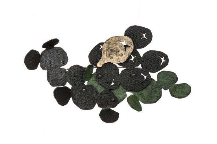 Yuko Fujita’s brooch unfolds as a quiet enigma. Its layered composition evokes a delicate tension between organic form and abstracted narrative. Dark, petal-like shapes cluster together in a rhythmic arrangement, their subtle textures suggesting fabric, foliage, or something in between. Small punctures cut into the surface, allowing light to slip through, creating a sense of movement and mystery.
