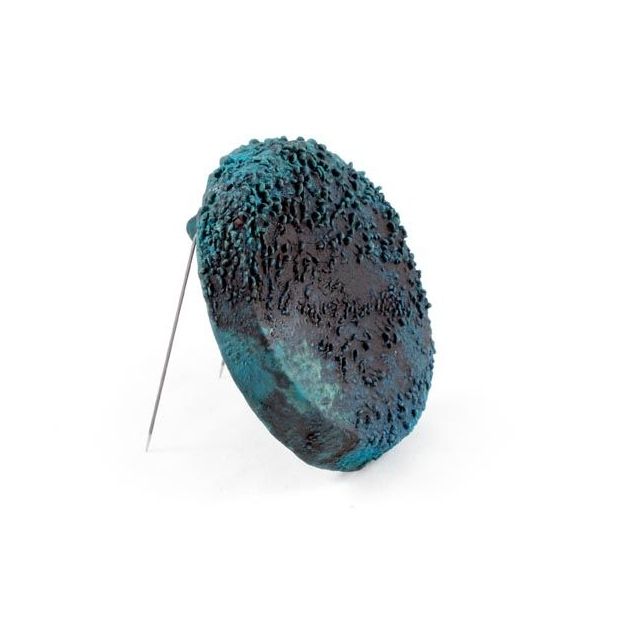 Dimitar Stankov’s Kabada brooch is an exploration of material transformation, where time and the elements leave their mark on metal. The surface, richly textured and layered with a deep blue-green patina, evokes a sense of history and organic decay. The carefully controlled oxidation process reveals an interplay of color and texture, with raised details that resemble barnacles or the rough surface of aged stone. The result is a piece that feels as if it has been unearthed, shaped not just by the artist’s hand but by the passage of time itself.
