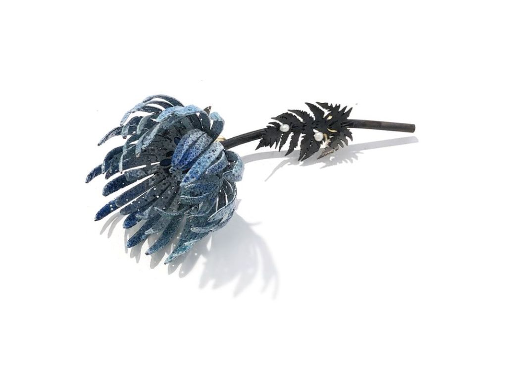 Petal-like elements extend outward in a radial pattern from the center, each one pierced and enameled in a dappled range of blues. These forms are rhythmic and dynamic, suggesting movement, while their finish invites a closer look. The darkened stem and leaf elements contrast sharply, grounding the composition with visual weight. Pearl accents nestled within jagged foliage offer unexpected softness amid the sharp contours.