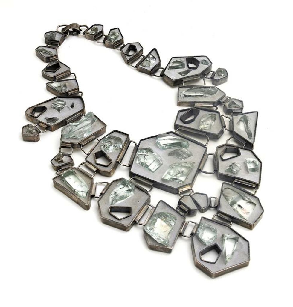 The necklace deliberately avoids symmetry, instead embracing an irregular arrangement that draws the viewer into its layered surfaces. Each individual segment seems to tell its own story through textured forms reminiscent of fractured urban landscapes and repurposed architectural elements. The overall effect is one of transformative beauty, where the raw, unyielding qualities of cement are elevated through careful articulation and artistic intervention.