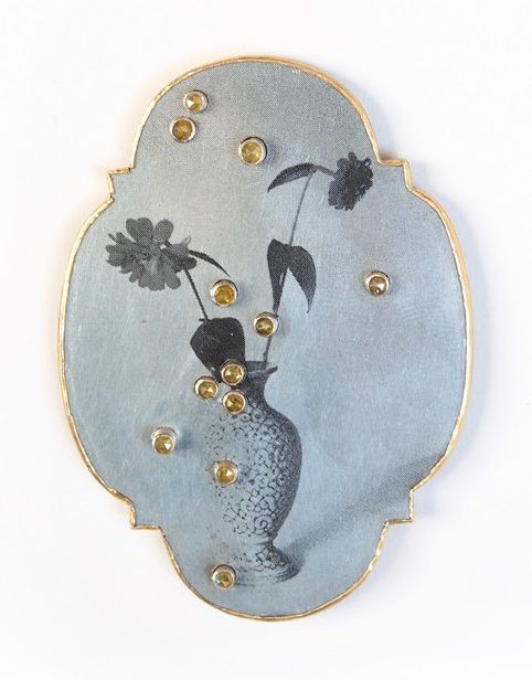 This brooch by Bettina Speckner brings together the romanticism of the past with a quiet, contemporary edge. The piece is shaped like an antique portrait frame, softened with subtle curves and trimmed in warm metal. At its center, a photographic image of a floral still life in grayscale feels both nostalgic and ghostly, like a memory suspended in metal. The surface is punctuated with small, round gold elements that resemble either scattered seeds or glints of light, adding a tactile layer and a hint of playfulness to the otherwise somber composition. It is a meditation on fragility, beauty, and time—all held gently within the palm of the hand.