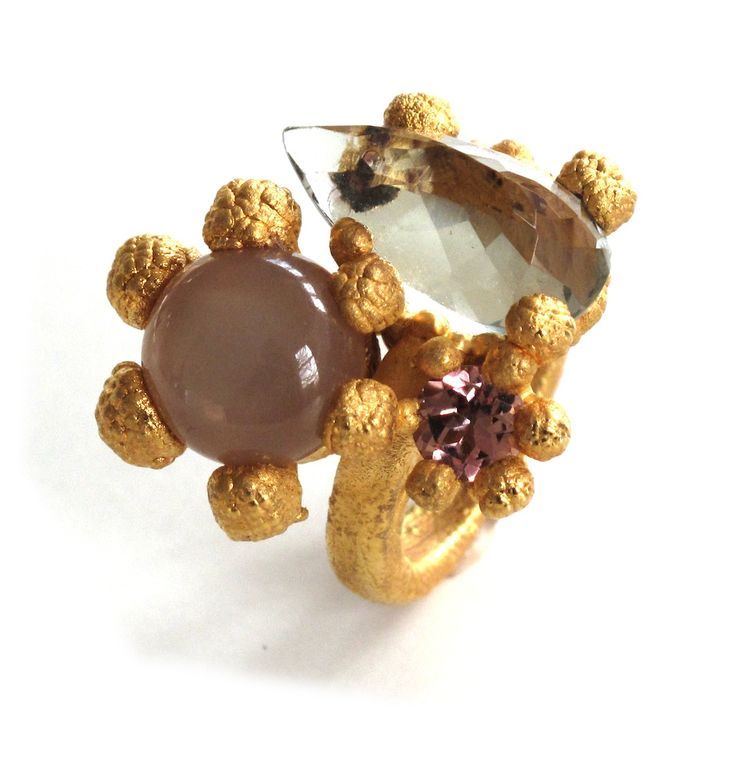 Pernille Mouritzen’s ring dazzles with an exuberant blend of color, texture, and form. The piece defies traditional symmetry, bringing together a faceted crystal, a milky cabochon, and a violet-hued stone in a vibrant cluster that radiates playful opulence. Each gem is cradled by richly textured granules of gold, their surface resembling coral or sea foam, echoing both organic growth and ornamental excess.