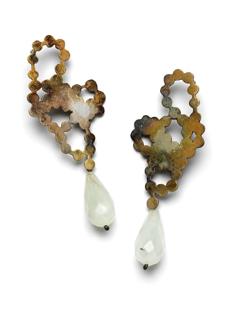 Åsa Lockner’s 2014 earrings in silver and chalcedony present a masterful interplay between asymmetry, light, and negative space. The pierced silver forms are loosely based on floral or cloud-like silhouettes, with their oxidized surfaces revealing a spectrum of burnished golds, earthy greens, and deep charcoal tones. This subtle patina enhances their organic irregularity, offering a sense of age and weathered elegance.