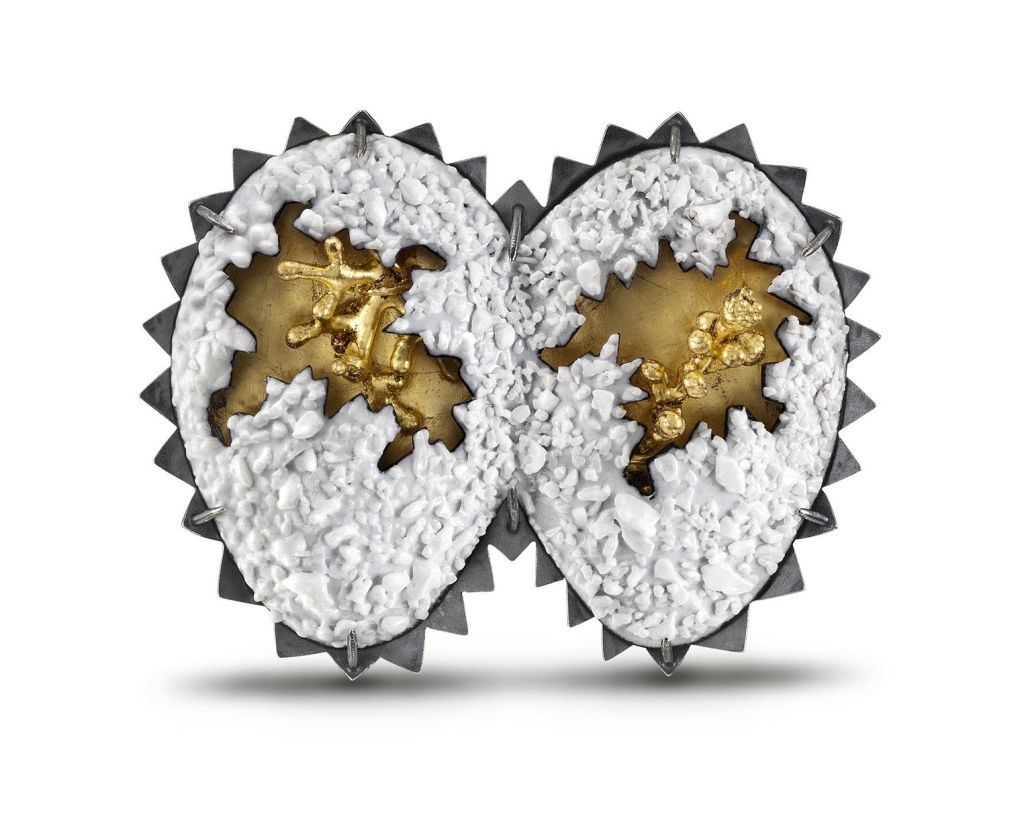 Wendy McAllister’s Albedo brooch presents a striking balance between containment and release. Its jagged silver border surrounds twin oval forms coated in a crust of bright white enamel. This textured surface recalls salt deposits or frost and is punctuated by sharp openings that reveal a golden interior. The contrast between the coarse, matte enamel and the gleaming gold beneath creates a sense of layered depth, as if something precious is breaking through a rough outer shell.