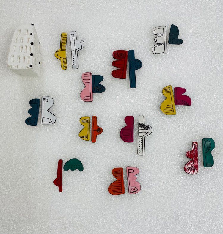 These earrings by Jane Frances Reilly bring a painterly presence to the body through their bold compositions and vibrant, layered surfaces. Flattened, circular, and abstract shapes act as canvases for blocks of color and rhythmic marks that evoke stitched seams, shadows, and architectural detail. The works feel spontaneous but intentional, each pair echoing the quiet confidence of the artist’s intuitive hand. Together, they form a language of abstract storytelling drawn from daily life, translating domesticity into wearability.