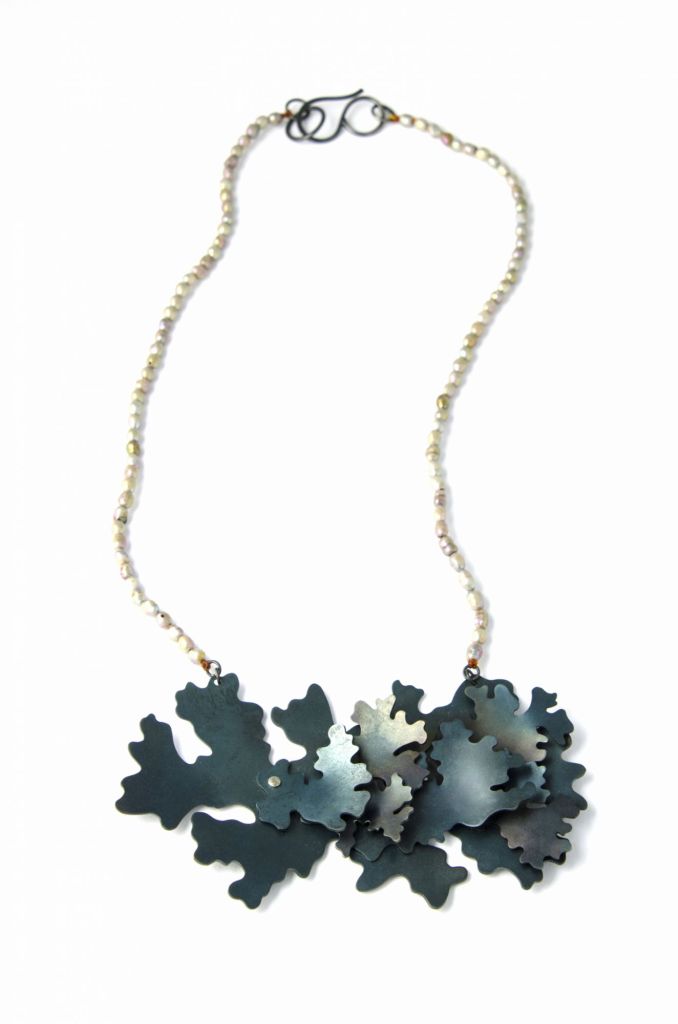 This necklace by Kate Bajic demonstrates her affinity for organic form and detail through a layered composition of hand-pierced elements, suggestive of overlapping lichen structures. Each shape carries a softened silhouette that evokes the irregular, flourishing contours of nature. The oxidation of the metal introduces a subtle, iridescent gradient that enhances the illusion of depth and shadow, drawing the viewer closer to the surface of the work.