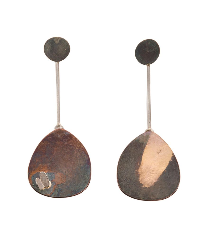 Formally, the earrings showcase Boieri’s interest in clean geometry disrupted by organic surface treatment. Symbolically, the contrast between polished and darkened silver suggests a tension between clarity and corrosion, an ongoing theme in Boieri’s studio practice. The work, though understated, carries the mark of careful handwork and a personal process of problem-solving that informs the final aesthetic. As is typical of Boieri’s work, the earrings function both as adornment and as records of material investigation.