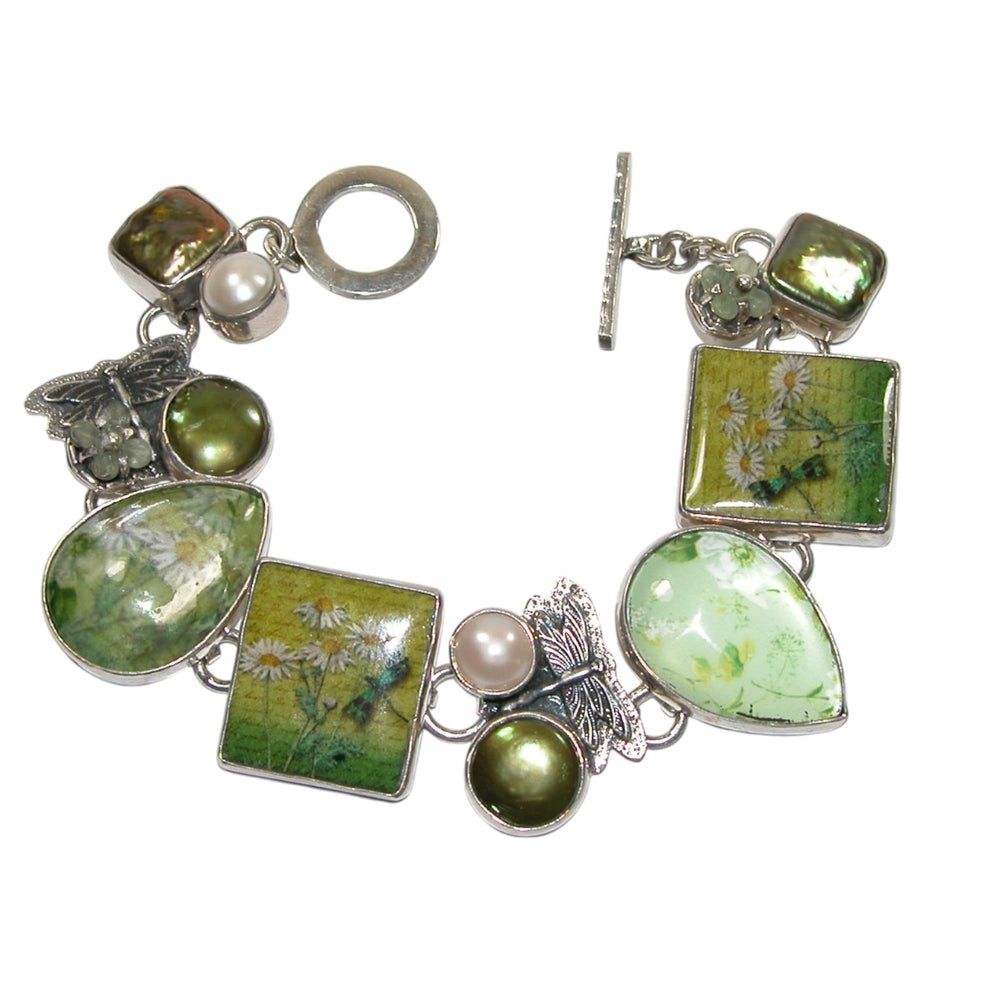This bracelet by Amy Kahn Russell exemplifies her distinctive approach to naturalistic jewelry design. Featuring bezel-set tiles with floral imagery, freshwater pearls, butterfly motifs, and green-toned cabochons, the piece brings together an eclectic mix of natural and representational elements. Each component is unified by a sterling silver framework that maintains formal consistency while allowing visual variety.