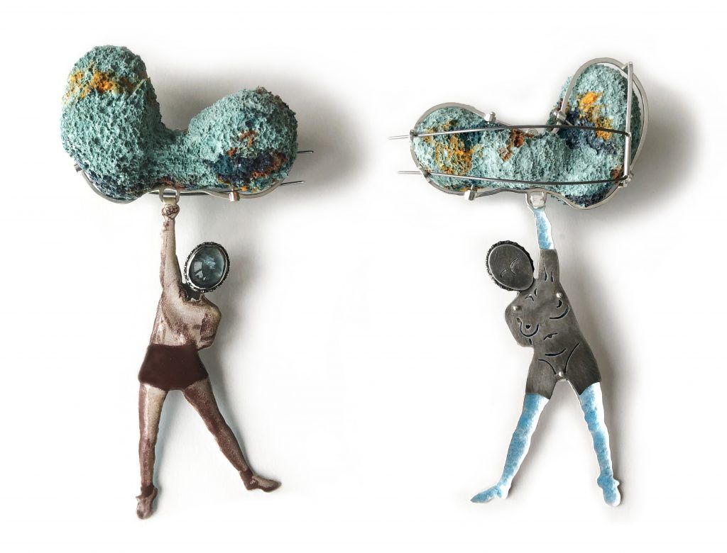 Nanna Obel’s brooch Heavy weight in blue (2021), created for Art Jewellery Copenhagen’s exhibition Copenhagen ReARRANGED at ATTA Gallery in Bangkok, combines silver, enamel, photo transfer, aquamarine, and a silicone form made by Malene Kastalje. The piece features a stylized female figure whose body dangles beneath a large, sponge-like mass. One arm reaches upward, grasping the weight above with comic resolve.