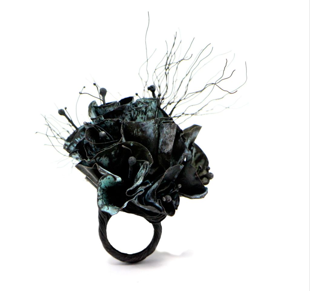 Ariel Lavian’s “Depths of Heaven” ring (copper and epoxy) captures organic form through complex structure. Layers of dark patinated copper fold into petal-like clusters, pierced by wiry protrusions that suggest growth under pressure. The form evokes deep-sea flora or subterranean blooms—natural phenomena thriving in the absence of light.
