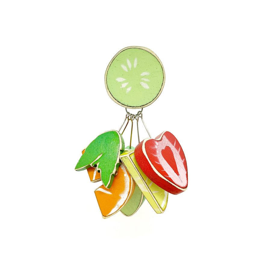 Morgan Hill’s Pimm’s Cup brooch, part of her Bad Habits collection, transforms a quintessential summer cocktail into a vibrant, wearable sculpture. Glossy enamel-painted charms: lemon slices, strawberries, limes, mint leaves. gather in an exuberant cluster that captures the visual and sensory excess of the drink it references. The dangling elements evoke both the ingredients of a Pimm’s Cup and the indulgent spirit that the piece celebrates. Pimm’s Cup explores the aesthetics of temptation and desire through playful form and saturated color.