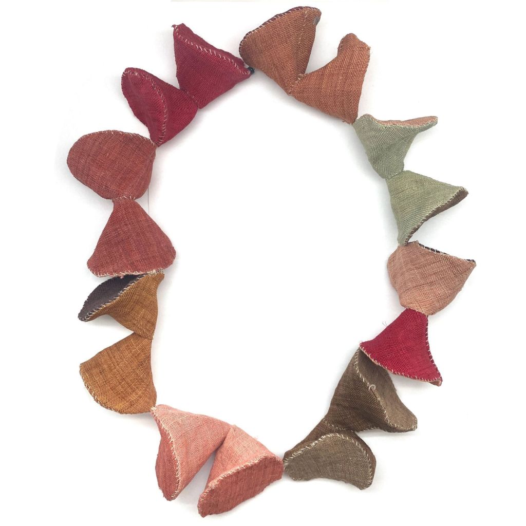 In Arirang No. 5, Myung Urso composes a soft and deliberate rhythm; one stitched from memory, material, and motion. Named after the iconic Korean folk song Arirang, the necklace hums with cultural resonance while remaining formally abstract. Each form is hand-dyed and sewn, shifting gently in scale and color as the necklace circles itself.