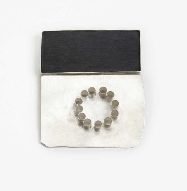 At first glance, Christine Matthias’ Brooch (2015) feels like a small monument that is quiet, deliberate, and certain of its form. Made of silver and ebony, the piece balances light against the dark with precision. The top section, a smooth panel of deep ebony, anchors the composition. Beneath it, a sheet of silver opens up like a horizon, soft and reflective. A perfect ring of hollow silver cylinders sits slightly raised from the surface, forming a circle that feels mechanical and tender. This piece is an emblem of continuity and remembrance.