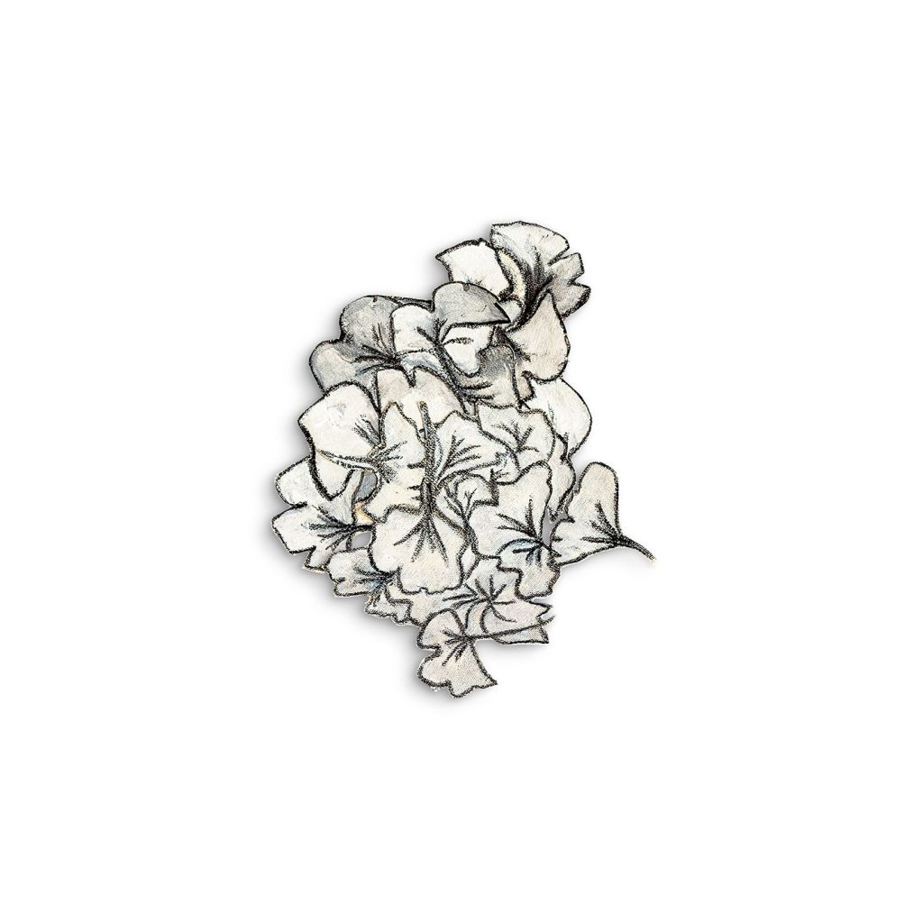 Symbolically, flowers are one of the most overused forms in adornment. They are easy to recognize and easy to consume. They can slip into prettiness without resistance. What makes Autumn Bouquet III successful is that it doesn’t use the bouquet as an ornament. Instead, it uses it as a container for attention. The flowers feel less like decoration and more like an emotional shorthand: a memory of something tender, pressed flat so it can be carried. There’s also something slightly uneasy about the bouquet’s density. It isn’t airy. It doesn’t drift. It crowds itself. The overlapping petals resemble accumulation, representing how memory builds when you return to the same image repeatedly, trying to preserve it without fully understanding why. Bessudo’s own language around the quotidian and “selective preserving” helps here: this is the kind of object that doesn’t document a grand event. It documents the smallness of lived experiences of what catches, what stays, and what refuses to disappear.