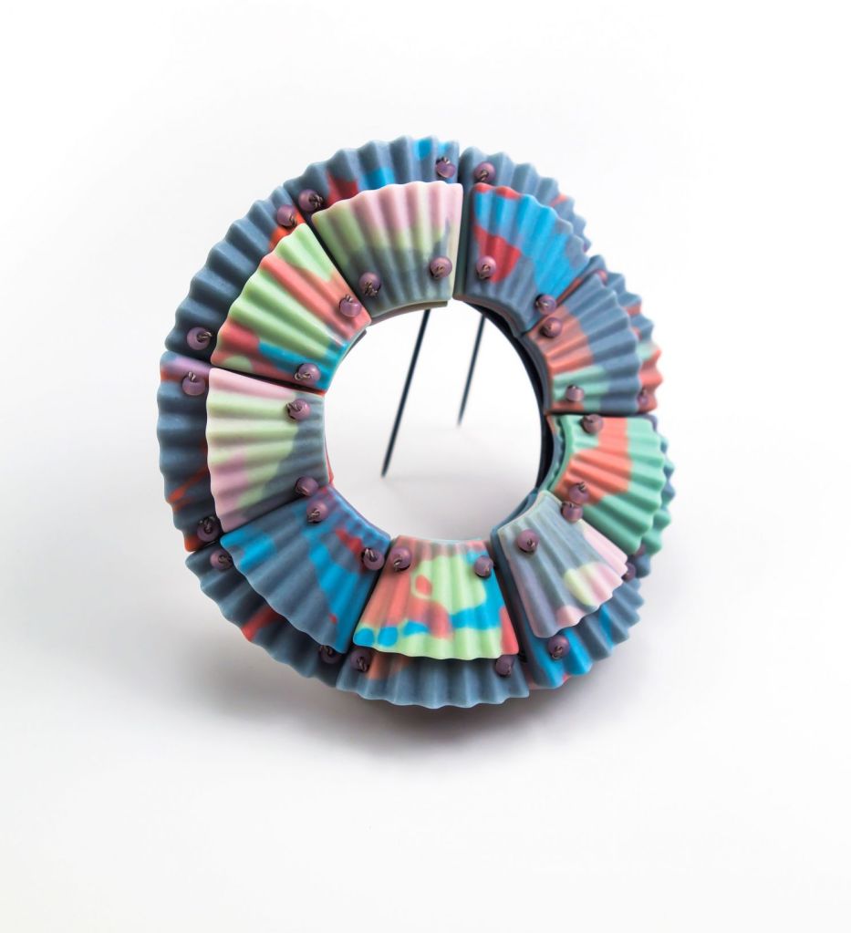 Mia Kwon’s Balance brooch is constructed from Mont-Blanc porcelain, slip cast into repeated pleated segments that are later assembled into a complete circular form. Each fluted module is individually shaped, pigmented, fired, and polished to a slick, almost lacquered surface. The units are then sewn together with thread and reinforced with silver and steel findings. Small beads are applied across the ridges, interrupting the rhythm of the folds and adding moments of tension. Though porcelain is traditionally associated with brittleness, Kwon’s technical control allows the elements to feel improbably light and textile-like.